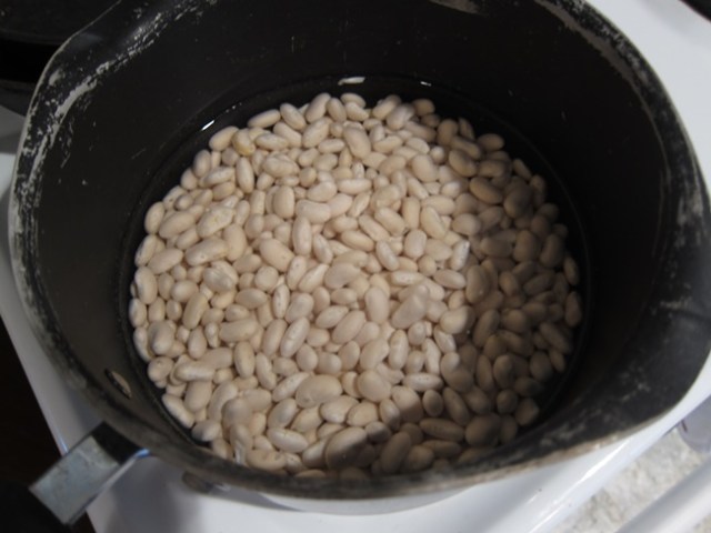 The day before, put the beans in a pot and add enough water to cover by an inch. Soak overnight.