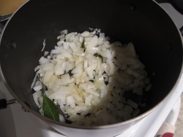 Meanwhile, in a large, heavy-bottomed pot, heat the oil over medium heat. Add the onion and herbs and cook until tender, about 10 minutes.