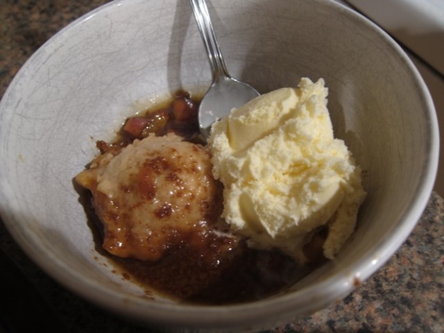 While the caramel apple mixture boils, combine the dry goods from the dumplings in a small bowl, and the liquids in a measuring cup. Stir together until no dry bits still exist. Spoon big spoonfuls of batter into the boiling caramel apple mixture, trying to space them out evenly. Cover the pot, reduce the heat to medium-low, and simmer for 15 minutes. Scoop, and serve with some vanilla ice cream!