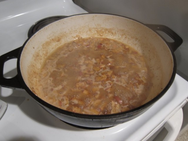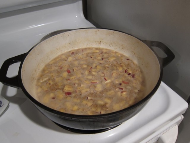 In a large saucepan/pot/dutch oven (something with a lid), combine the butter, brown sugar, milk, and diced apples over medium-high heat. Bring to a boil, and continue to cook at a low boil for 20 minutes, stirring occasionally.
