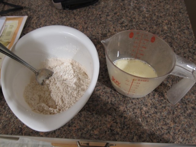 While the caramel apple mixture boils, combine the dry goods from the dumplings in a small bowl, and the liquids in a measuring cup.
