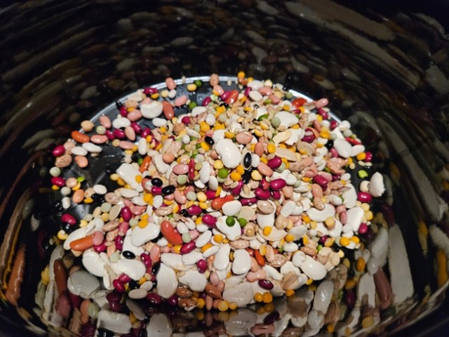 - 1 package 15 bean soup bean mix (there’s a Hambeens option, which you’d throw out the ham flavoring mix from, and a Goya one that’s actually 16 beans and no ham packet, at my supermarket)
