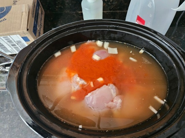 After the 7 hours, remove the bay leaf and discard. Remove the chicken onto a plate and shred, then return to the crock pot.