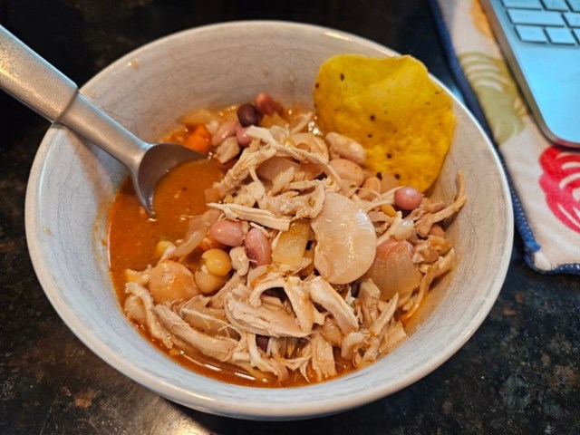 A tasty, filling, probably decently healthy soup that cooks most of the day in a crock pot – it may seem unusual, but 7 hours on high is right – you’ve got a whole bag of dried beans, they need a good amount of cooking! This recipe calls for chicken thighs, and I used them, but in general I find them annoying – so much fat I feel like I’ve thrown away half the chicken just trimming the excess!
