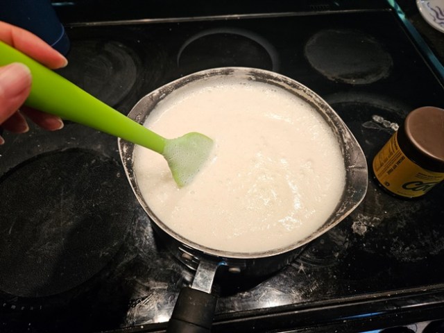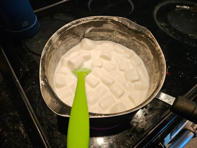 Cook, stirring frequently, until the marshmallows completely dissolve. Remove from heat and let cool for a few minutes, then place in the refrigerator until chilled, 20-30 minutes. (If you leave it for substantially longer, it’ll firm up quite a bit, but can be mixed back in with the mixer in the next stage.)