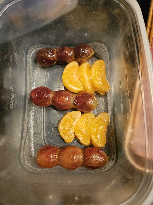 Let the tanghulu cool for a few minutes, then enjoy! I ended up sliding the leftovers off of their skewers for easier storage, and as mentioned above, the moisture from the mandarins eventually weakened the outside of those ones (after 2-3 days) but the grapes kept very well in a tupperware in the fridge, for a few days.