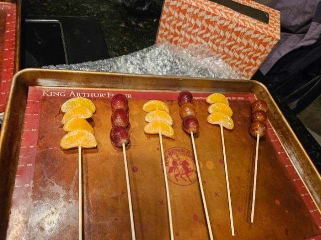 I had friends over around the holidays and suggested making tanghulu, because I’d had the recipe bookmarked for a while. One of my friends had been seeing teens making it in the microwave and burning themselves recently, so that is possibly a thing, but we managed to make it with no injuries, and I quite enjoyed the result! You get a hard candy coating on the fruit(s) of your choice!