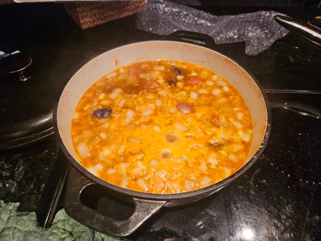 Add the broth, soy sauce, honey, potatoes, and beans. Season with a bit more salt and pepper, then bring to a boil. Cover, and reduce the heat to medium-low for a gentle boil, and cook 10 minutes. While you wait you should have time to tear up all that kale!