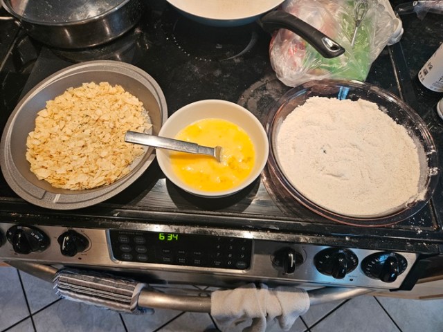 To prepare the chicken, set up a dredging station. Set out plates/pie plates/bowls, with: 1) flour, garlic powder, and black pepper stirred together, 2) the two eggs, beaten, and bowl 3) the crushed chips.