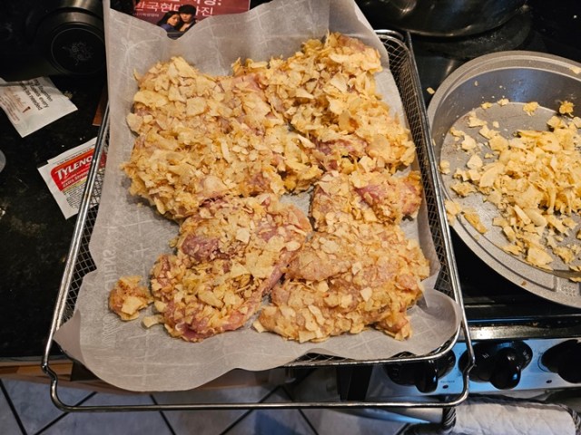 Past the dish with chips, you’ll want the basket/pan for your air fryer, probably lined with parchment so you won’t have to clean it later. Preheat the air fryer to 380 degrees. Dredge the chicken in the flour, then eggs, then chips, placing the coated chicken in the air fryer basket.