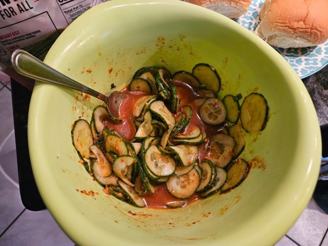 Despite having no sugar, the pickles taste a bit sweet, at least when directly contrasted with the kimchi. The sauce for the chicken itself is really good and I bet I make it again soon to put on many other things!