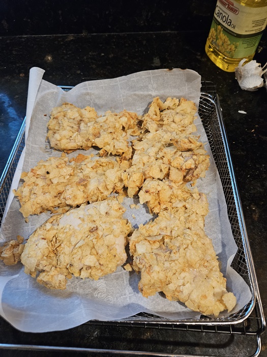 To prepare the chicken, set up a dredging station. Set out plates/pie plates/bowls, with: 1) flour, garlic powder, and black pepper stirred together, 2) the two eggs, beaten, and bowl 3) the crushed chips. Past the dish with chips, you’ll want the basket/pan for your air fryer, probably lined with parchment so you won’t have to clean it later. Preheat the air fryer to 380 degrees. Dredge the chicken in the flour, then eggs, then chips, placing the coated chicken in the air fryer basket. Cook in the air fryer for 15-18 minutes total, flipping in the middle. At the end check with a thermometer that the thickest piece of chicken has reached 165 degrees.