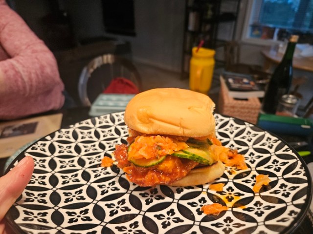 Melt a tablespoon of the butter in a skillet and toast an open bun, cut-side-down, until golden brown, adding more butter as needed to toast all four buns. Spread a bit of butter on the inside of each bun, then place a piece of chicken on the bottom bun, some pickles, and some kimchi. Put on the top piece of the bun and enjoy!