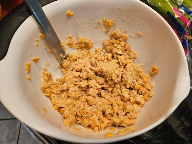 Place all the chickpeas in a large bowl and use a fork to mash them until the majority are mashed and only a handful are still whole.