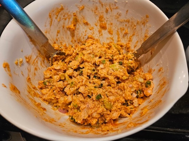 Stir in the celery, green onion, shallot, buffalo sauce, tahini, lemon juice, powdered garlic, paprika, salt, and pepper until evenly mixed.