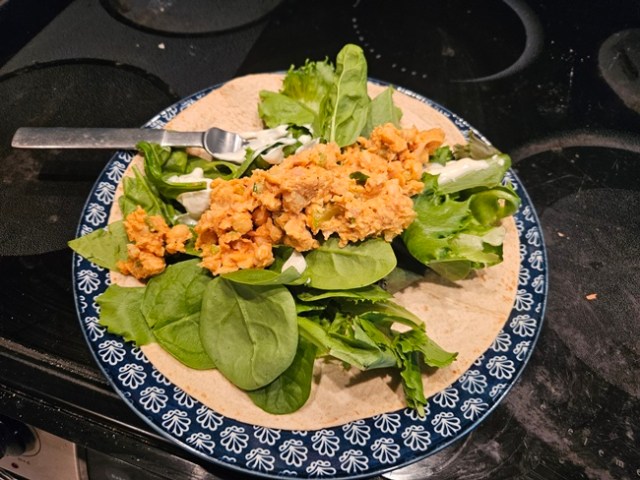 To serve, briefly microwave a wrap to soften, add a few handfuls of greens and some blue cheese dressing.