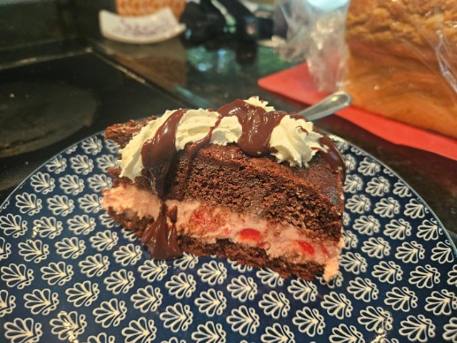 Once the cake has frozen, take it out of the freezer, take off the top half, and discard the parchment circle. Spread as much of your soft ice cream as it takes to make a solid ice cream layer covering the bottom layer of cake, then top with the top slice of cake. Freeze until solid. Serve in slices topped with whipped cream and hot fudge sauce.