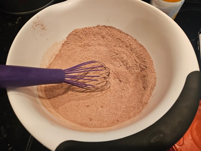 In a large bowl, which together the flour, sugar, baking powder, baking soda, salt, and cocoa powder.