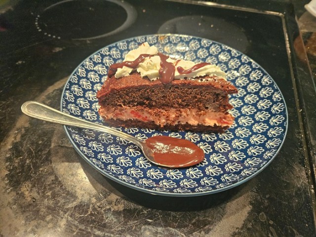 Once the cake has frozen, take it out of the freezer, take off the top half, and discard the parchment circle. Spread as much of your soft ice cream as it takes to make a solid ice cream layer covering the bottom layer of cake, then top with the top slice of cake. Freeze until solid. Serve in slices topped with whipped cream and hot fudge sauce.