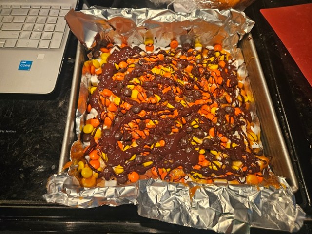Pour the caramel over the marshmallows, using your silicone spatula as needed to help it get down between all the marshmallows to attach them to the graham crackers. Sprinkle the Reese’s evenly over the top and gently press into the caramel/marshmallow mixture.