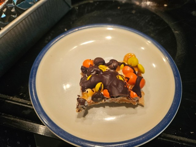 In a microwave-safe bowl, combine the caramel bits and milk, and microwave for 1 minute. Stir well, then microwave in additional 30 second bursts until it stirs together entirely smoothly. Pour the caramel over the marshmallows, using your silicone spatula as needed to help it get down between all the marshmallows to attach them to the graham crackers. Sprinkle the Reese’s evenly over the top and gently press into the caramel/marshmallow mixture.
