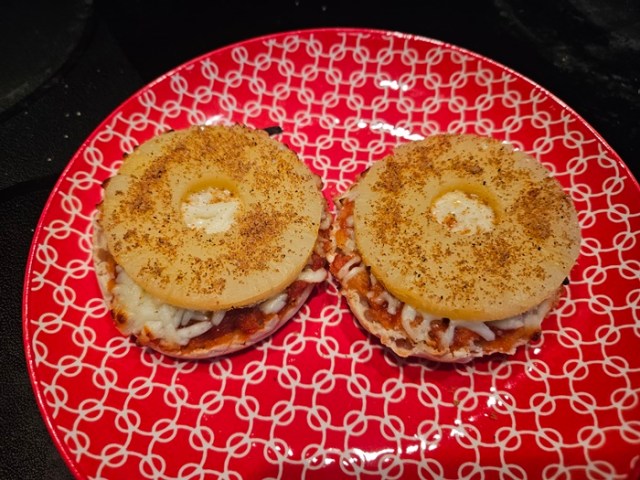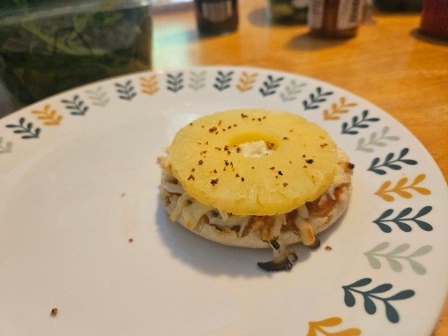 Obviously this is not for everyone, but I got very excited at some point thinking about the size of pineapple rings vs the size of English muffins and had to try it out, then made things way tastier with the addition of some buffalo spice mix.