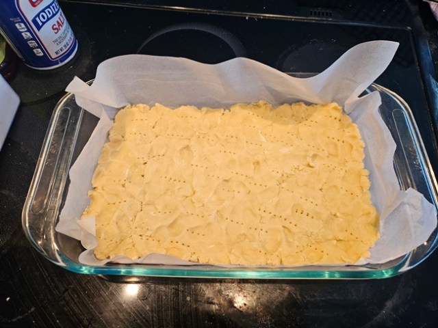To make the shortbread, preheat the oven to 300 degrees. Line a 9×13″ dish with parchment long enough to let you pull the bars out later, and set aside.