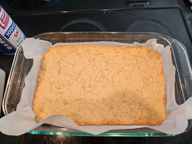 Remove from the heat, stir in the salt, and then quickly pour over the shortbread, spreading with a silicone spatula if needed to get an even layer. Let cool to room temp.