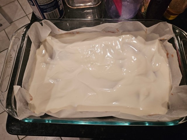 When you’re ready, melt the white chocolate and oil in the microwave (the chocolate probably has instructions on the package – I was pleased how well store brand white chocolate melted), stir until smooth, and then spread in an even layer over the caramel.