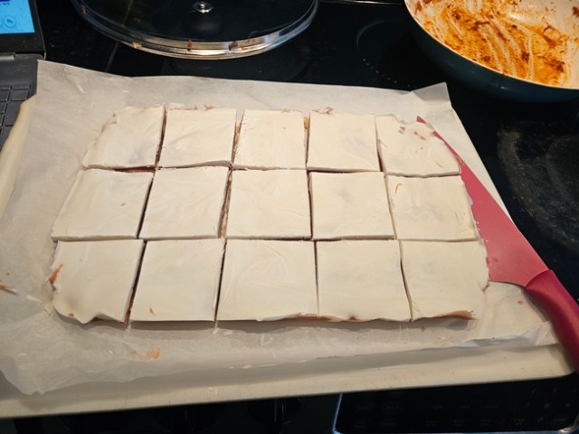 When you’re ready, melt the white chocolate and oil in the microwave stir until smooth, and then spread in an even layer over the caramel. Let set at room temperature or in the fridge, then remove from the pan and slice.