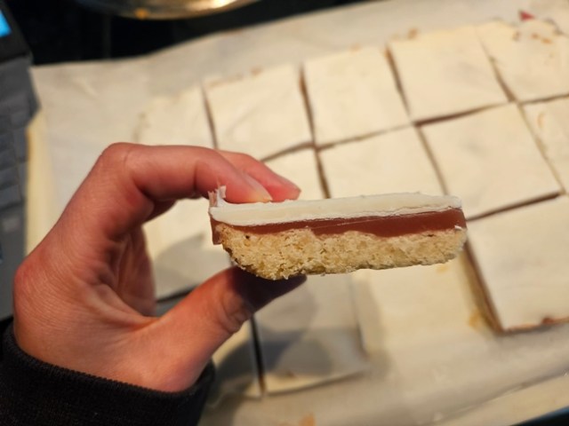 Reduce the heat while you add the butter, sugar, and cream, then raise to medium-high and cook until the mixture reads 255 degrees on a candy thermometer. Remove from the heat, stir in the salt, and then quickly pour over the shortbread, spreading with a silicone spatula if needed to get an even layer. Let cool to room temp.