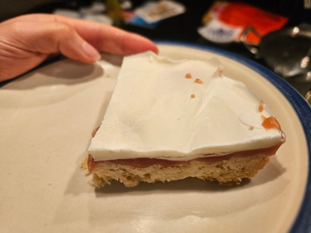 A delightful combo of flavors here that should go over with your friends! The lemon in the shortbread is stronger than you’d expect from just a bit of zest, and the berry caramel is something new. Actually, regarding the berry caramel, it turns out the person that made it first got ~4 cups (frozen) berries and heated them up until they could strain out 2 cups of juice – I didn’t realize that and just bought the closest to ‘mixed berry juice’ I could find, which was this berry/grape, and it worked just fine. The flavor may be even more strongly berry-y if you make your own from berries?