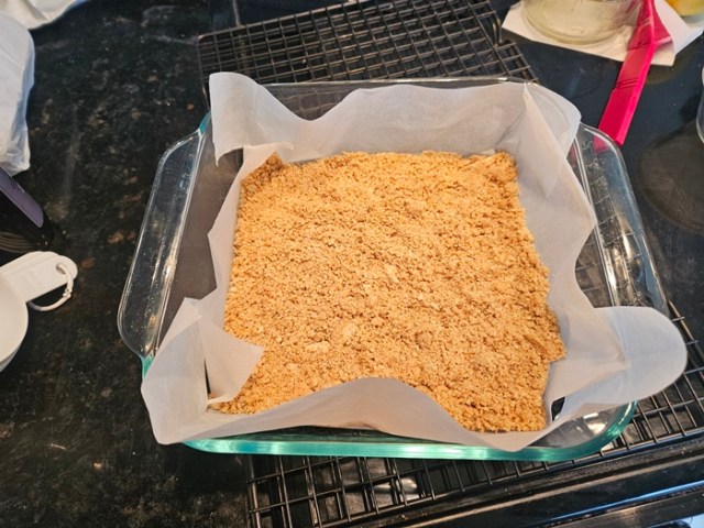 - 1 cup graham cracker crumbs (the original recipe said ~8 full-sheet graham crackers, but it only took 5 1/2 for me)