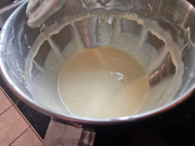 Beat in the sugar, lemon juice and zest, and vanilla, making sure to scrape down the insides of the bowl.