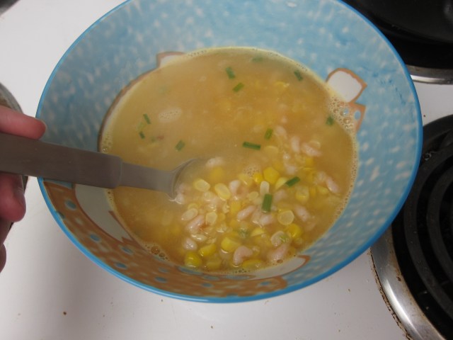 Add the stock, corn, prawns, and the chili paste/sauce if using.