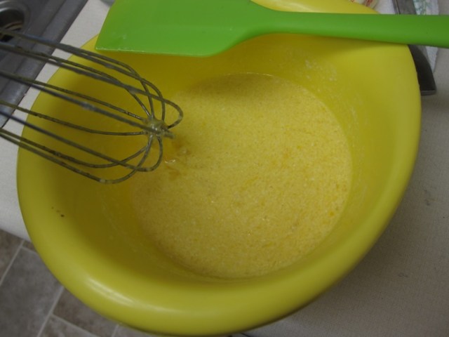 Beat in the milk, eggs, and vanilla until evenly combined.