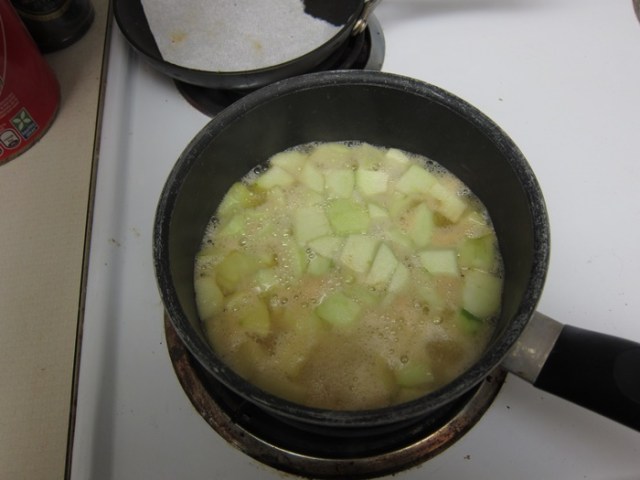 While the cake cools, make the glaze by melting the butter, sugar, and water over medium high heat. Boil 1-2 minutes, then remove from the heat and add the hard cider (or extra puree) and stir together. Make the cinnamon sugar coating by stirring the ingredients together in a small dish.