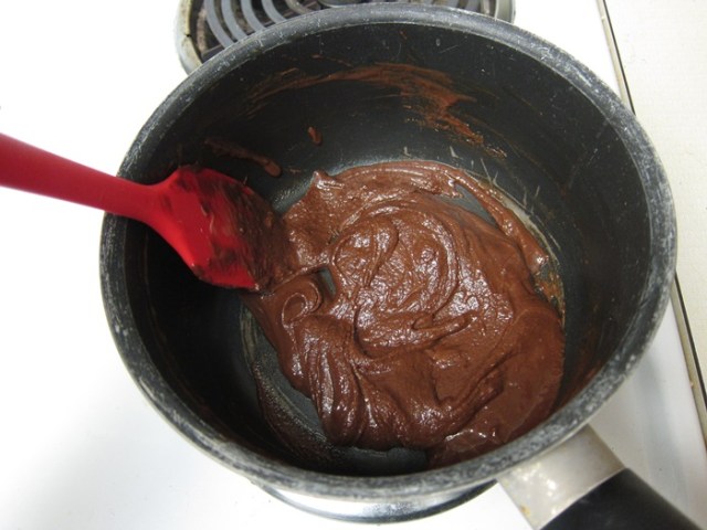 Cool the cake in the pan for 45 minutes, then turn out onto a wire rack to cool completely. While the cake finishes cooling, combine the glaze ingredients in a double boiler over boiling water and stir until everything is melted and smooth.