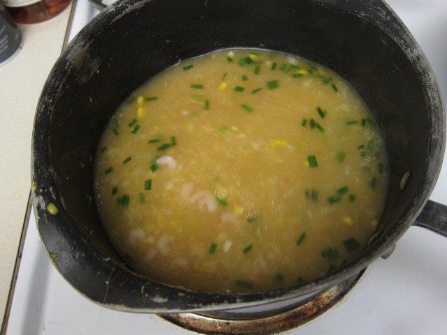 Add the stock, corn, prawns, and the chili paste/sauce if using.