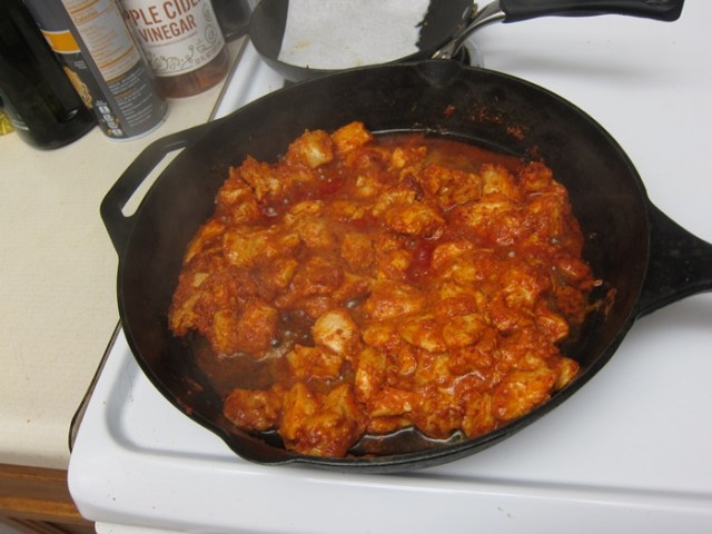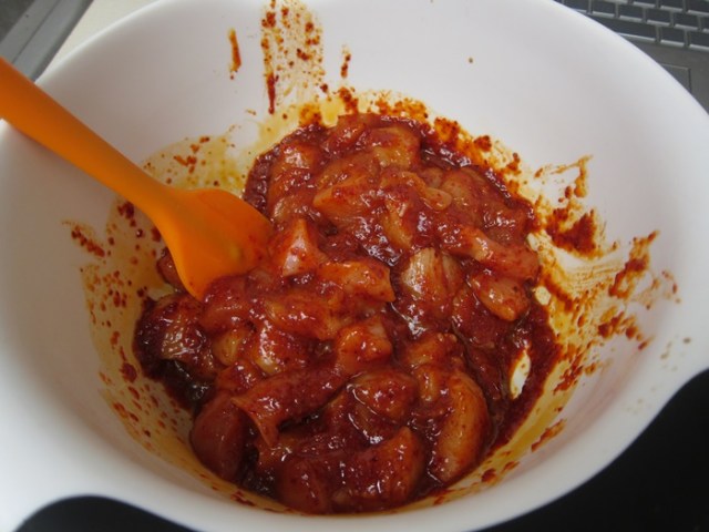 Add the chicken, turn to coat, and set aside. I actually did this part before work this most recent time I cooked this, to make things faster in the evening, but a long marinating time isn’t necessary.