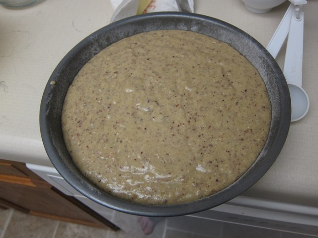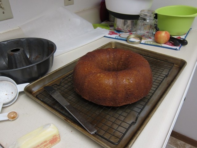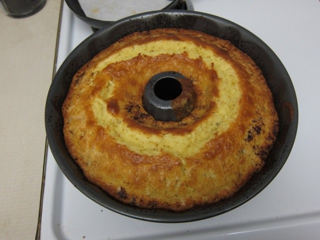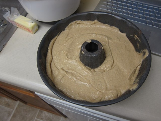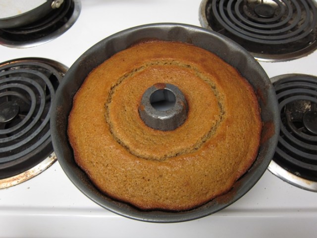 Pour the batter into the prepared bundt pan and bake 1 hour, or until it passes the toothpick test.