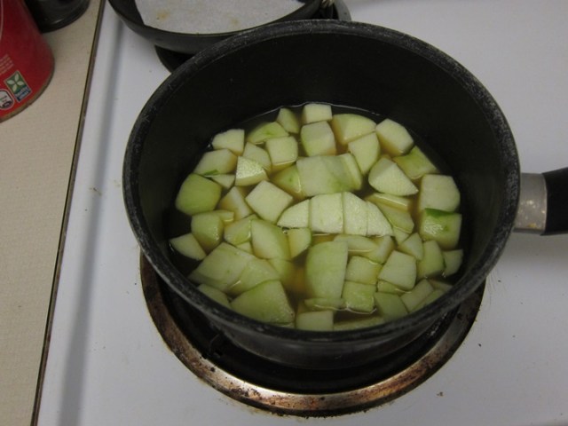While the cake cools, make the glaze by melting the butter, sugar, and water over medium high heat. Boil 1-2 minutes, then remove from the heat and add the hard cider (or extra puree) and stir together. Make the cinnamon sugar coating by stirring the ingredients together in a small dish.
