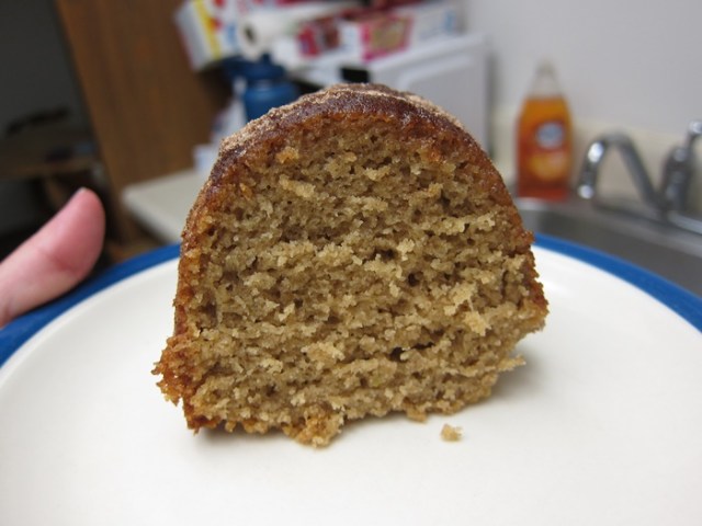 Put a pan under your wire rack, then pour or brush the glaze evenly over the cake. Sprinkle the cinnamon sugar coating onto the glaze, pressing into the sides as needed. Slice, and enjoy!