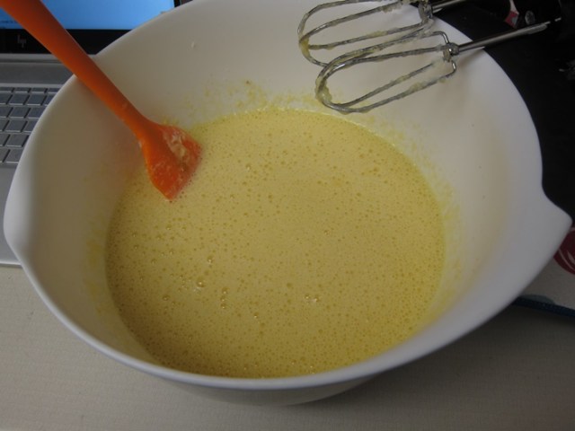 Beat in the milk, eggs, and vanilla until evenly combined.