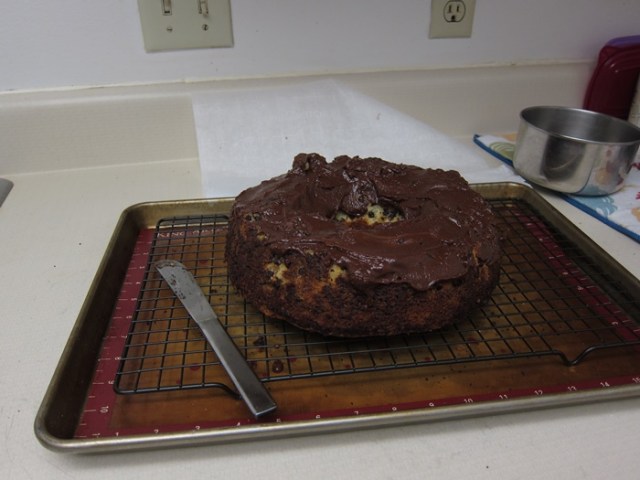 Cool the cake in the pan for 45 minutes, then turn out onto a wire rack to cool completely. While the cake finishes cooling, combine the glaze ingredients in a double boiler over boiling water and stir until everything is melted and smooth.