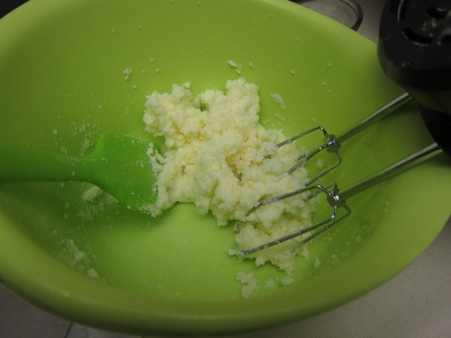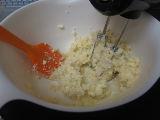 In a large bowl, cream together the butter and sugar until smooth, then beat in the extracts and the egg. Beat the dry goods into the butter mixture a bit at a time until combined.