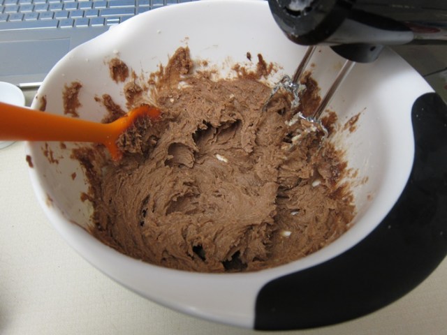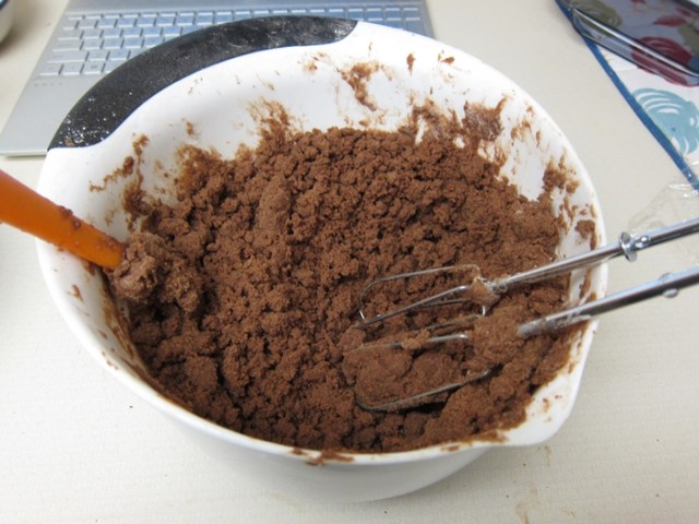 Beat the dry goods into the butter mixture a bit at a time (I did roughly quarters) until combined. Similar to creaming at the start, if it still looks dry, and even once it’s been beaten into larger sort of balls of dough, keep beating until you reached a sort of creamed texture again, when it holds together, and (if you’ve got a stand mixer) comes away from the sides of the bowl.