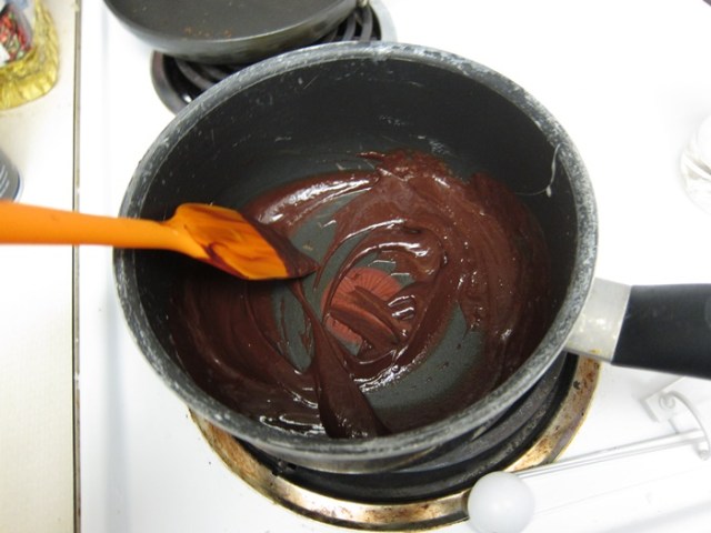 To make the glaze, bring the cream to a boil. This is obviously a real tiny amount of cream, so don’t take your eye off it for long! Remove from the heat and stir in the chocolate, then the corn syrup, then the water.
