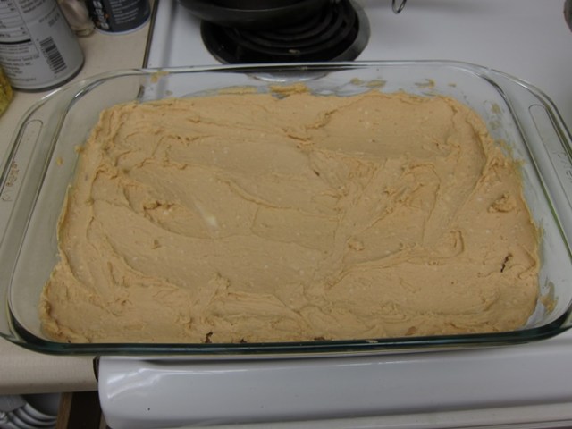 Transfer batter to the greased cake pan and spread evenly, then top with the pie filling.
