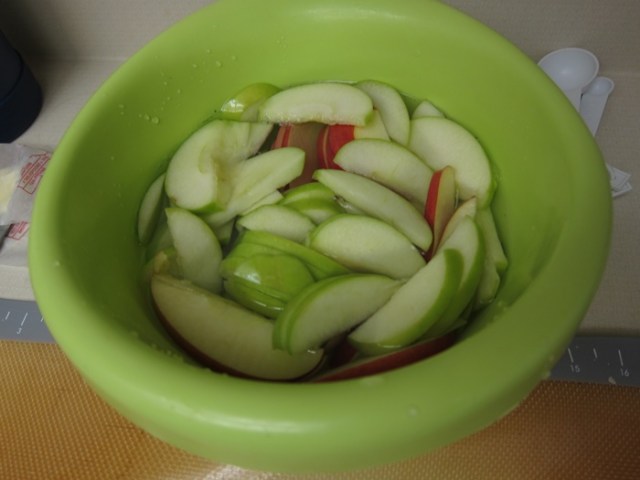 Towards the end of the rising time, prepare your apple slices, placing them in the water with a bit of lemon juice to help prevent browning. Lightly grease 2 8″ or 9″ cake pans.